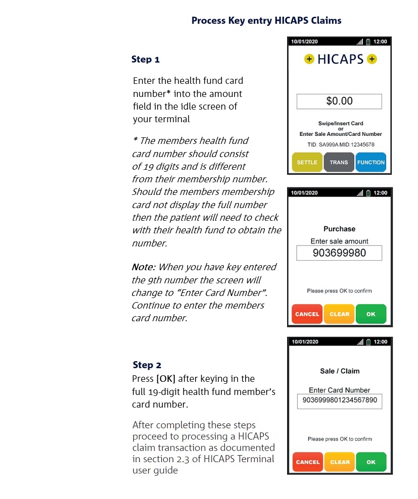 The Practitioner can then initiate the claim through the terminal by following the instructions below on how to key enter the card number.