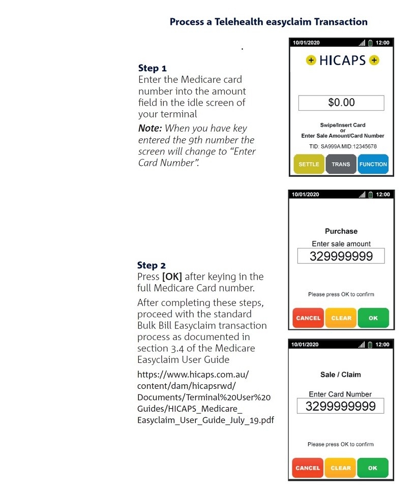 Practitioners will be able to conduct a telehealth consultation where the patient supplies their assignment of benefits to their provider by sending an email to their provider. The Practitioner can then initiate the claim through the terminal by following the instructions below on how to key enter the card number.